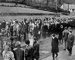 August 1973. March from Coalisland to Dungannon along route of first civil rights march. Carrying front banner from left: Brigid Bond, Jimmy Doris, D. O'Hagan, Kevin McCorry, M. McGurran, Brian O'Reilly and Edwina Stewart. |