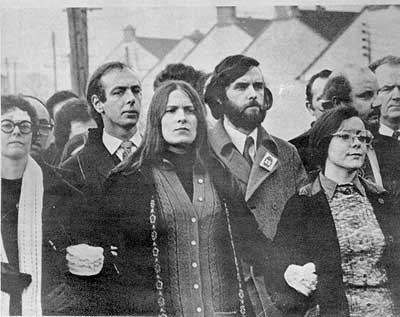 The events at Derry on Bloody Sunday have been well documented and the full story is told in NICRA's publication "Massacre at Derry". In brief, 13 people were murdered in cold blood by members of the Parachute Regiment [and a 14th died several weeks later of wounds he sustained that day]. Jackie Duddy, Kevin McElhinney, Paddy Doherty, Bernard McGuigan, Hugh Gilmore, William Nash, Michael McDaid, John Young, Michael Kelly, Jim Wray, Gerard Donaghy, Gerald McKinney and William McKinney were among the 20,000 who marched down William Street demanding an end to internment, the introduction of proportional representation, the complete abolition of the Special Powers Act, legislation to guarantee the rights of all political groupings including those opposed to the existence of the state, an end to discrimination, the establishment of an impartial and civilian police force .. They were demanding basically the same reforms which had been demanded on the road from Coalisland to Dungannon in August, 1968. They were demanding the same rights as those who were batoned off the streets of Derry in October, 1968, and now, four years later they were met not with batons but with bullets, and when the guns were silenced the thirteen lay dead. Brian Faulkner and Edward Heath had given their response to the demand for civil rights.