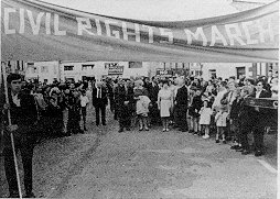 24th August 1968. The start of the very first civil rights march which took place from Coalisland Square to Dungannon. In the front row can be seen early veterans of NICRA. From left to right: Fred Heatley talking to Betty Sinclair and Frank McGlade directly behind her; Con McCluskey, Derek Peters (Under the "No Apartheid banner); Rebecca McGlade; Frank Gogarty, Kevin Agnew and John Mclnerley both standing sideways to right of front line. |