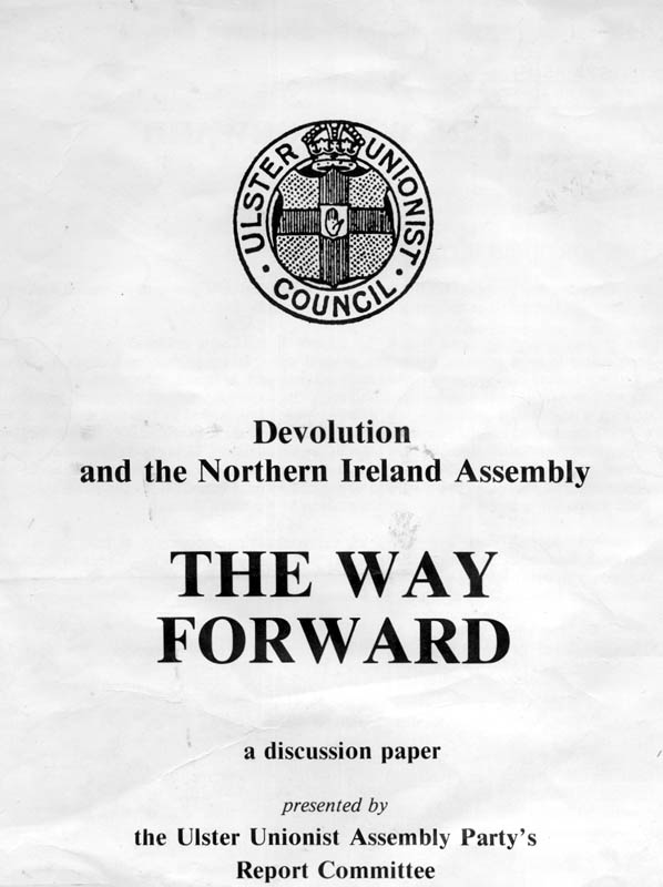 The Ulster Unionist Party while consistently opposing the unworkable framework under which the present Assembly was set up, has been equally consistent in its declared objective of transforming that Assembly into a worthwhile institution for serving all the people of Northern Ireland. With this objective in view and bearing in mind the necessity for obtaining the widest possible consensus, the Ulster Unionist Party proposes that those functions and powers transferred from County and County Borough Councils to Stormont should be devolved to the Northern Ireland Assembly as the nucleus of its responsibilities.