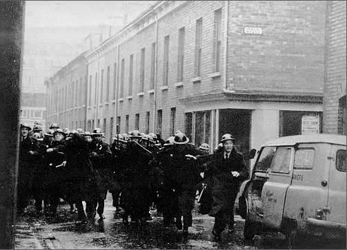 Meanwhile, the crowd in Guildhall Square had moved in a body towards Victoria Barracks to protest against failure to act against the policemen responsible for the attack on individuals and houses on January 5th. The barracks has a certain emotive significance to Derry citizens; they associate it, not with a foreign garrison, but as housing place for a gang of licensed thugs. Skirmishes broke out, and a wholesale attack began. Paving stones were dragged up, objects hurled and police driven into the building. Police reinforcements poured into town, and a full-scale battle developed through the streets of Derry. Police, aided by Protestants strategically placed within the city walls, fought with Catholic crowds. Casualties exceeded two hundred, a majority of these being police. Then as the situation seemed about to quieten, the police repeated the medicine used to quell the popular spirit on January 5th. A force a hundred strong rushed through Catholic slum areas smashing windows and doors, batoning, beating and stoning. On one occasion shots were fired. The pathetic Minister of Home Affairs issued a public statement telling how these had been fired by a police sergeant and directed into the air to deter possible attackers. He has never tried to contradict this statement, nor explain how a bullet was discovered lodged in the interior of an inhabited dwelling house. So the connivance of the government with the Orange extremists detonated another explosion. The real, primary, and justified cause of public discontent in Derry-police attack on people in their own houses-was repeated as a cure on April 19th.