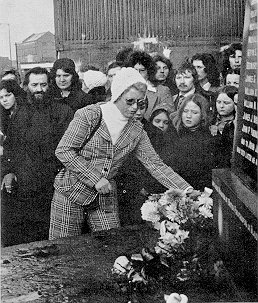 January 1974. Sister of one of the Derry Dead laying wreath on the Memorial to the 14 dead of Bloody Sunday. The monument was erected by NICRA and was funded by supporters from the USA and other parts of the world including Australia and New Zealand. |