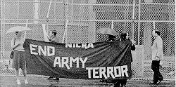 1975. Demonstration outside Springfield Road RUG/Army Barracks. On the right, holding the banner is Edna Zimmerman of the National Association for Irish Freedom New York. |