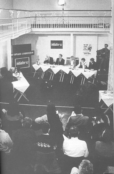 Perhaps one of the most significant civic contributions was Initiative 92, which described itself as a citizens inquiry. A group of civil activists established a commission, which sat from 1992 to 1993, to take opinions from the community and political parties on the way forward. It was composed of weighty individuals from Ireland and Britain and was chaired by Professor Torkel Opsahl from Norway. Opinions vary on its impact. Its findings may not have been particularly original, and its lasting contribution may have been its efforts to encourage community groups and individuals to think and discuss the options for the future. As a result the wider community began to have greater confidence in putting forward its views and engaging with the political process and politicians from whom it had felt alienated for so long. For example, the leaders of the seven main coordinating bodies of industry, business and trade unions formed a loose group, known as the G7, through which they developed opportunities for dialogue with politicians. Two local newspapers, identified with the sectarian divisions, began to work together, even printing a common editorial on one occasion.