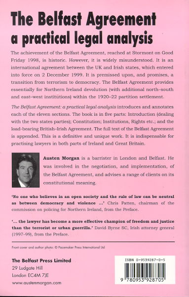 The Belfast Agreement: a practical legal analysis introduces and annotates each of the eleven sections. The book is in five parts: Introduction (dealing with the two states parties); Constitution; Institutions, Rights etc.; and the load-bearing British-Irish Agreement. The full text of the Belfast Agreement is appended. This is a definitive and unique work. It is indispensable for practising lawyers in both parts of Ireland and Great Britain.