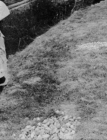 During the night several truckloads of newly-quarried stones were brought to the Claudy area and distributed along the high ridge of a field marking the marchers' route on their final day. Each of the people involved in these preparations has served with the Ulster Special Constabulary. This picture shows some of the stones left behind after the attack.