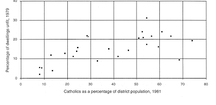 The report of the 1974 HCS give a description of the typical unfit dwelling stating that it was: "...a terraced or detached house built prior to 1919, is owner occupied or privately tenanted, lacks at least four amenities ... is in a state of high disrepair, and has a net annual valuation less than £14." (NIHE 1974 p8). Each of the HCSs conducted by the Housing Executive have demonstrated the close association between amenity provision and unfitness. The 1971 Census data, considered in Section Three, gave clear evidence that Catholic households were significantly less likely to have exclusive use of a fixed bath, an inside toilet, or hot water, than Protestant households. Figure 4.5 shows the percentage of dwellings lacking at least one amenity, according to the 1974 HCS, and the percentage of Catholics in each of the 26 district councils. As with unfitness there is a strong correlation between those areas with large Catholic populations and the provision of amenities in dwellings. Figure 4.5 Percentage of dwellings lacking at least one amenity (1974) by percentage of Catholics (1971), district council areas |